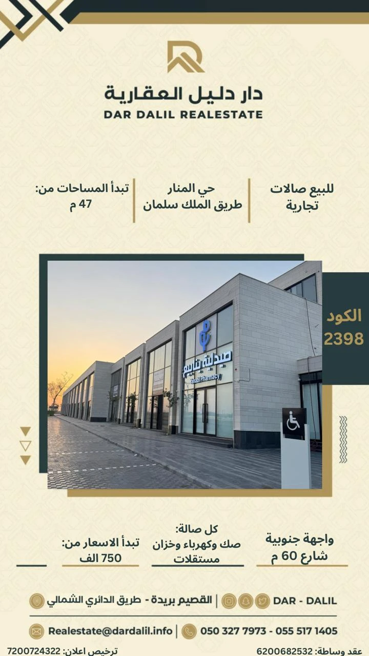 المساحات تبدأ من 47 م -كل صالة صك وكهرباء وخزان مستقلات
