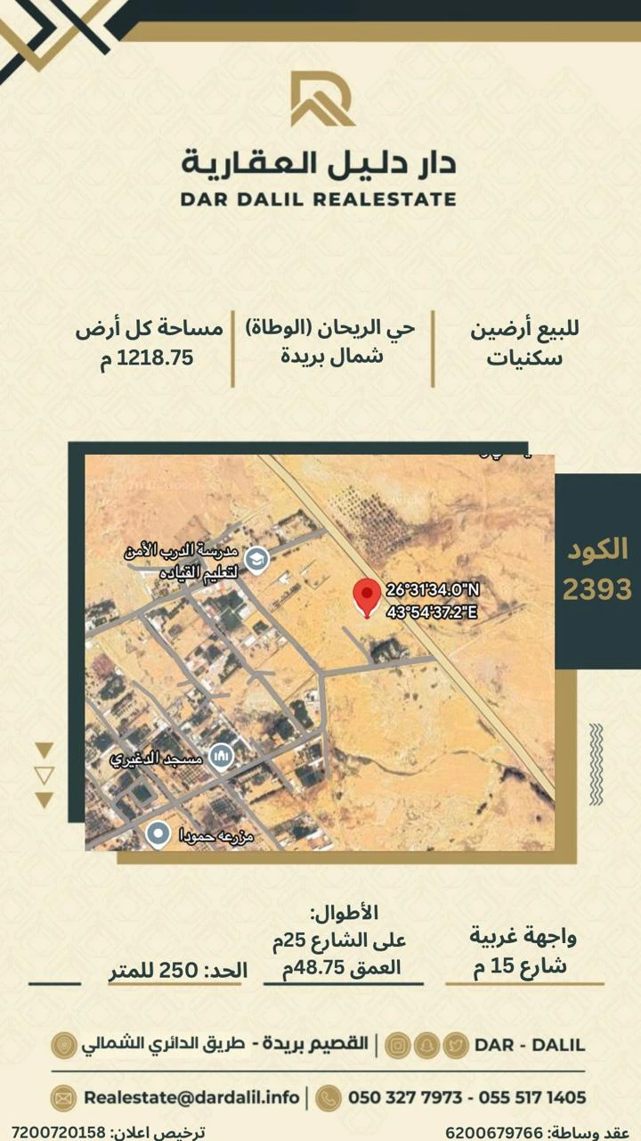 المساحة لكل أرض 1218.75 م